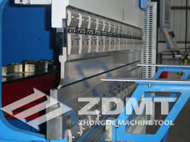 本系列液壓折彎機是雙缸上動式的數(shù)控液壓折彎機,它通過伺服比例閥上的各類閥門動作來驅(qū)動左右油缸的伸長與返回,從而帶動滑塊的上升與下降。滑塊的同步采用全閉環(huán)電液伺服控制技術,滑塊位置信號由兩側光柵尺反饋給數(shù)控系統(tǒng),再由數(shù)控系統(tǒng)控制同步閥的開口大小,自動調(diào)節(jié)油缸進油量的多少,從而控制滑塊(Y1、Y2)軸的同步運行,始終保持對工作臺的平行狀態(tài)。