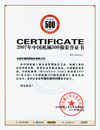 中德公司入選2007年(第五屆)“中國機械500強”
