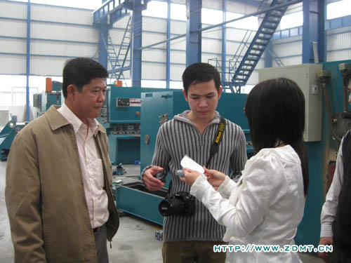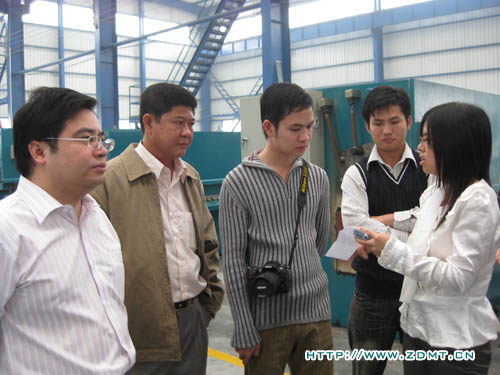 KONG KHEANG先生已經跟我們通過網絡和電話聯(lián)系了近一個月,對中德機床表現(xiàn)了強烈的購買需求。此次專程拜訪中德,正是為了洽談有關雙機事宜,順便實地考察。KONG KHEANG先生從事板料加工多年,對機器的操作是輕車熟路,目前自己的工廠里也有幾臺被撕去標牌的中國機床。這一次,實實在在的看到中德的機床以后,光光是機身油漆的光潔,整體的外觀,就使他很激動,親自體驗了一下我們一臺正在調試的折彎機,然后心滿意足的笑了。